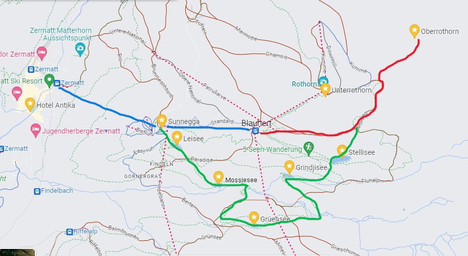 .파란색; 푸니쿨라와 곤돌라 이용하여 수네가와 블라우헤르트에 오른 후,