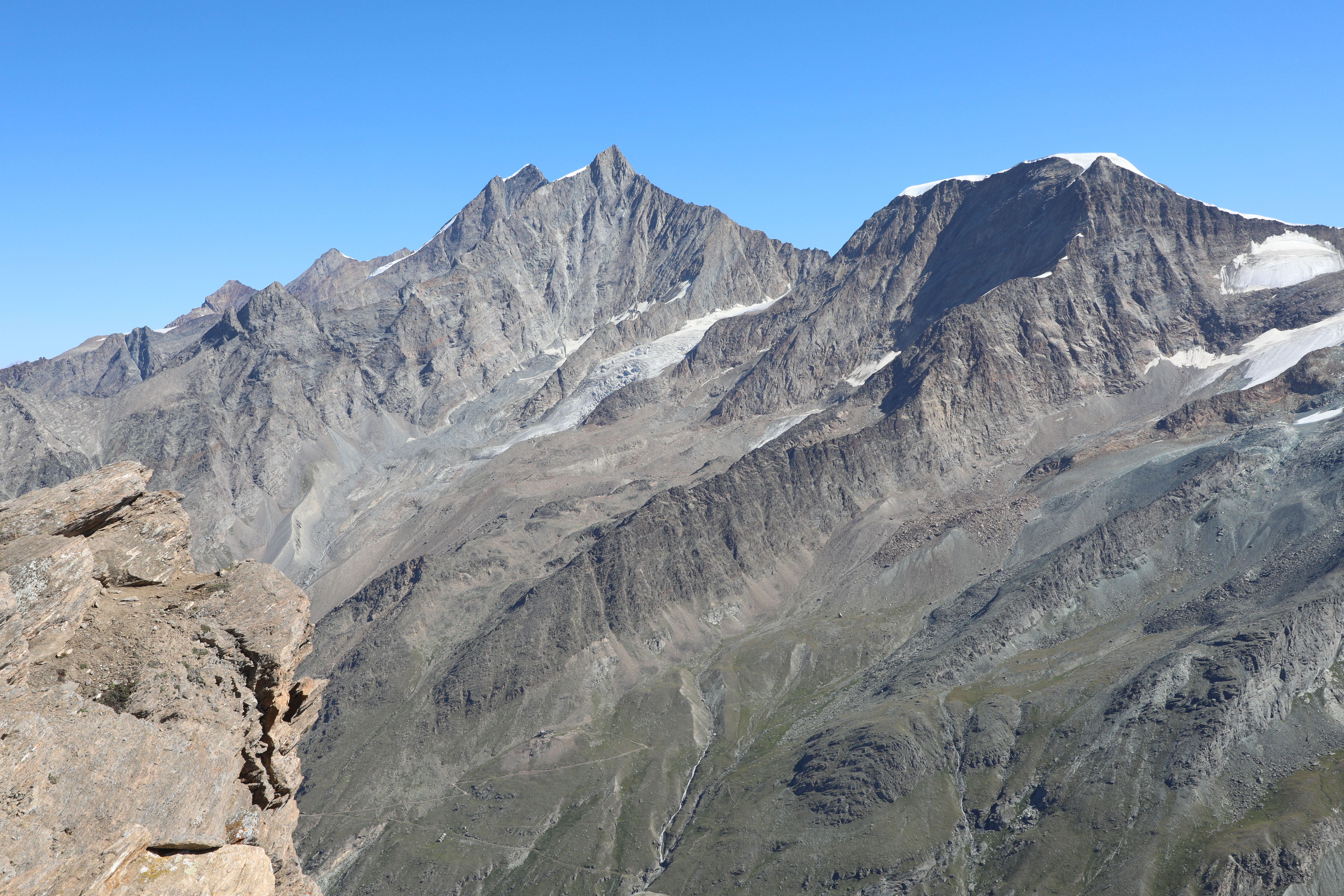 좌측 알프스 산맥에서 두 번째로 높은 Dufourspitze(4634)와 Lyskamm(4527). 브라이트호른(Breithorn.4164).